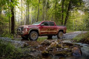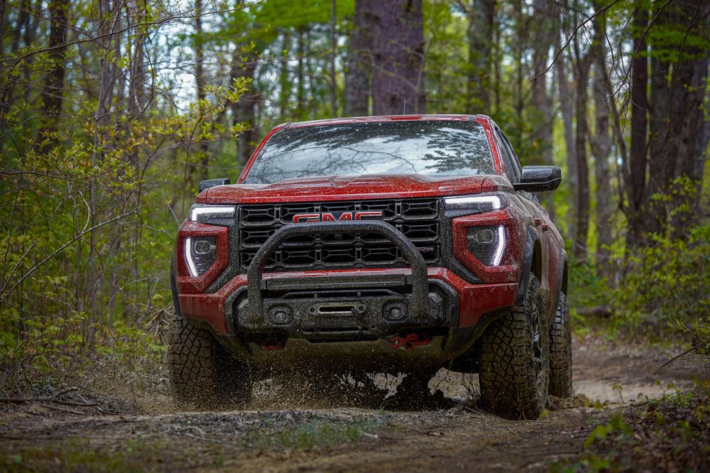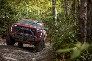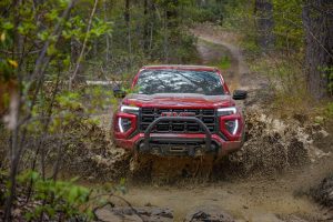 The Canyon AT4X is built for serious off-road performance. It features a factory 3-inch lift, 33-inch mud-terrain tires, Multimatic DSSV dampers, and front and rear electronic locking differentials for maximum traction. Baja Mode enhances high-speed desert driving, while heavy-duty skid plates and rocker protection increase durability. The AT4X AEV Edition takes capability even further with 35-inch tires, additional lift, and upgraded hardware designed for extreme terrain adventures.